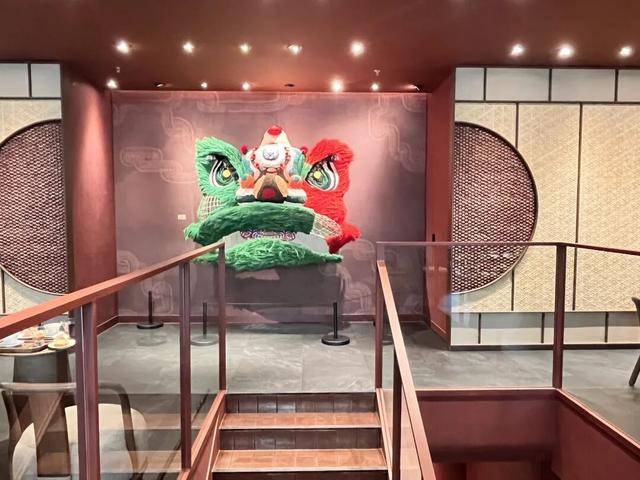 二楼楼梯端背景墙的非遗醒狮,则融合粤剧戏服面料、竹编工艺与星巴克标志性绿围裙元素。