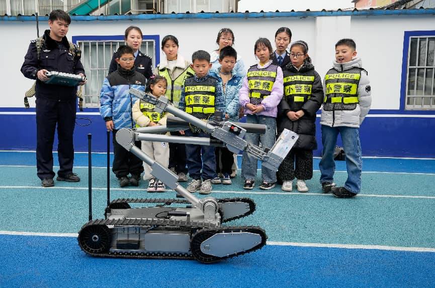 在警营“硬核装备区”前,孩子们自觉排起了队伍。南京铁路公安处特警支队民警将排爆机器人、无人机、反恐水枪、战术背心、防暴盾牌、伸缩警棍、抓捕钢叉等装备整齐陈列,还带来了冲锋枪、步枪等制式武器,引得萌娃们阵阵惊呼。“这面防暴盾牌能抵御冲击力,重量足有8斤,叔叔们执勤时要长时间手持,守护大家的安全。”民警一边讲解装备用途与使用规范,一边示范标准操作,随后邀请萌娃们亲身尝试。穿戴好沉甸甸的战术背心,手持警盾与警棍摆出防卫姿势,孩子们的小脸上满是认真与自豪,在亲身体验中感受着警察职业的荣光与担当。